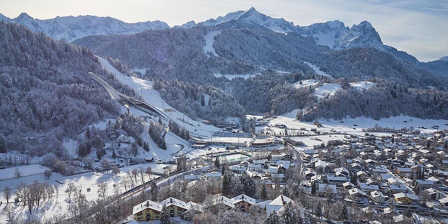 Diese fantastische Aussicht genießen Sie im Dorint Sporthotel Garmisch-Partenkirchen. Blicken Sie vom Hotel aus auf die berühmte Skisprungschanze, einer der vier legendären Austragungsorte der Vierschanzentournee. Direkt vor der Tür warten bestens präparierte Pisten, steile Abfahrten und traumhafte Loipen. Nach all der Action in den Bergen steht Ihnen der größte Sport- und Wellnessbereich der Region auf 4.000 m² zur Verfügung. Hier heißt es: Auspowern im Fitnessstudio mit Blick auf die Berge, relaxen in der Saunawelt oder eine Runde schwimmen im Pool.